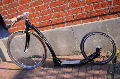Der Effendi ATR (AllroundTretRoller). Die Gabel hat negative Gabelvorbiegung und ist für 65 mm-Nabe gebaut. Lenkwinkel ist 75°, also steiler als üblich. Dadurch wird der Roller nicht so lang, aber die Lenkerposition ist wie beim RTR. Als Farbe habe ich "dormant fire red" (mit schwarzer Schrift) gewählt. Reifenbreiten gehen bis 50 mm (Big Apple). Größe 451 ist auch möglich. Der ATR scheint mit Ultremo ZX 406-Reifen nicht wirklich langsamer zu sein als der RTR28 mit Conti GP4000, was mich selbst erstaunte.